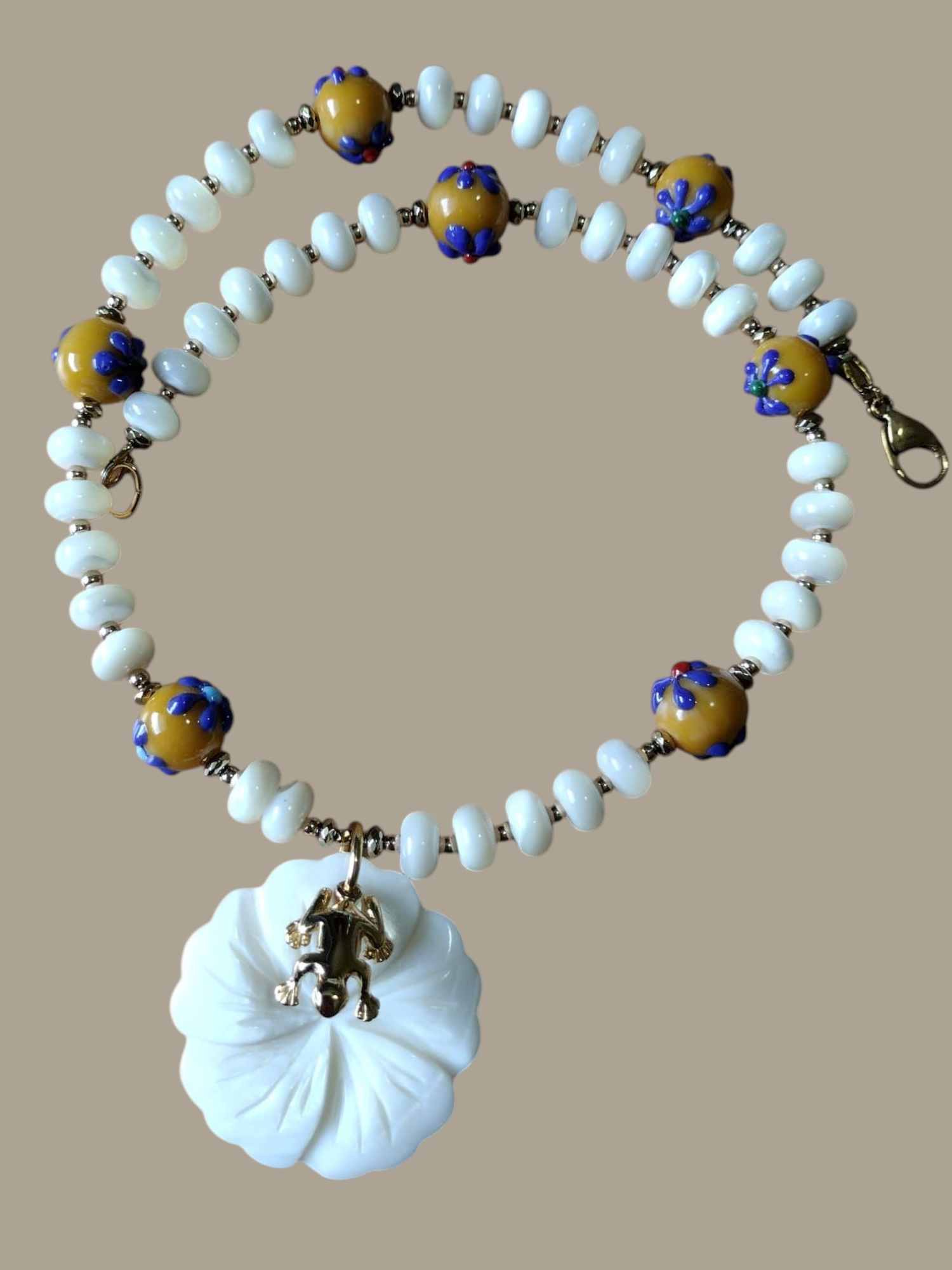Madre Perla, Lampwork, Flor en Nácar y terminaciones en Stainless Steel