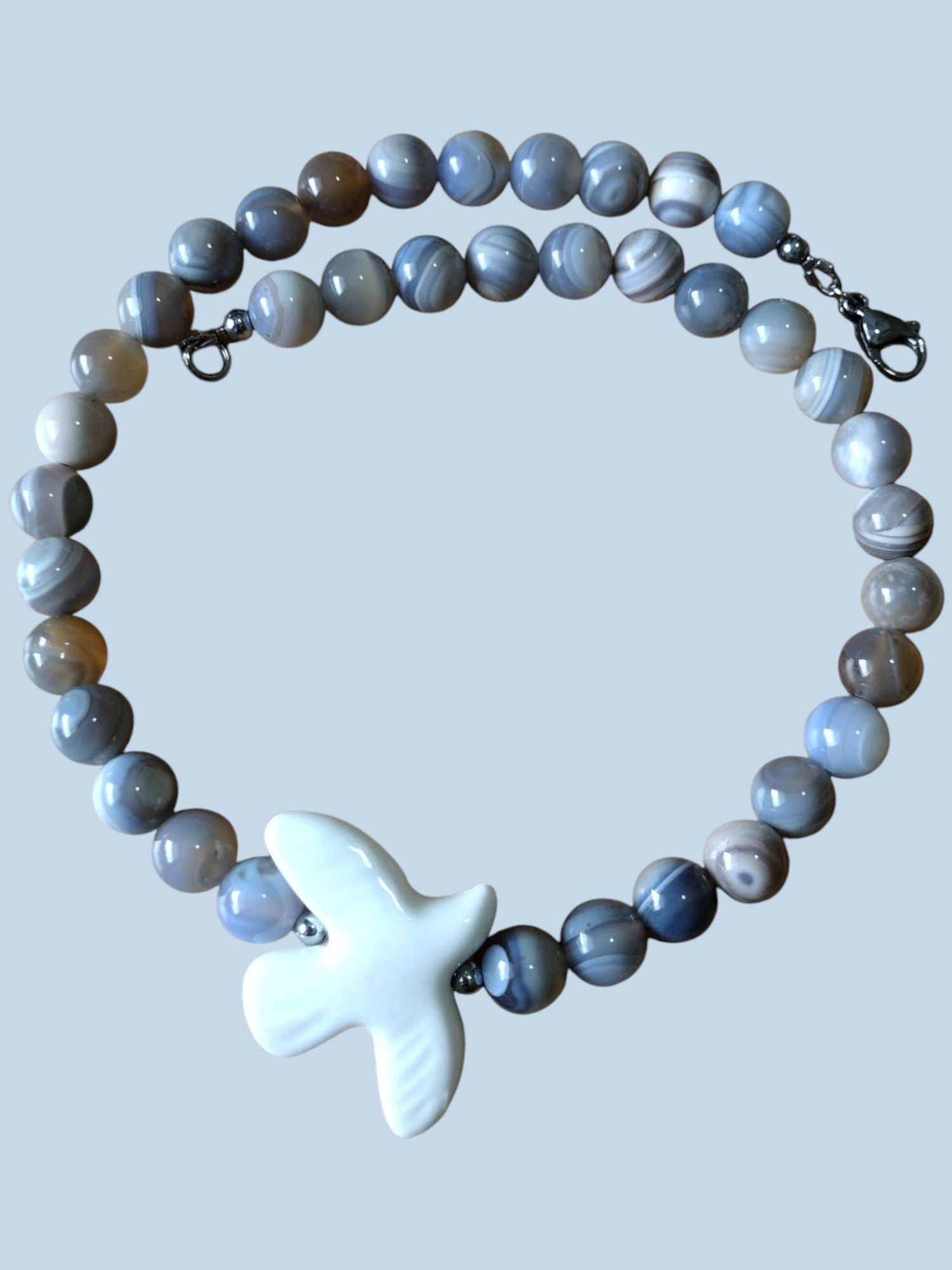 Primer collar: Agatas, Paloma en cerámica y terminaciones en Stainless Steel